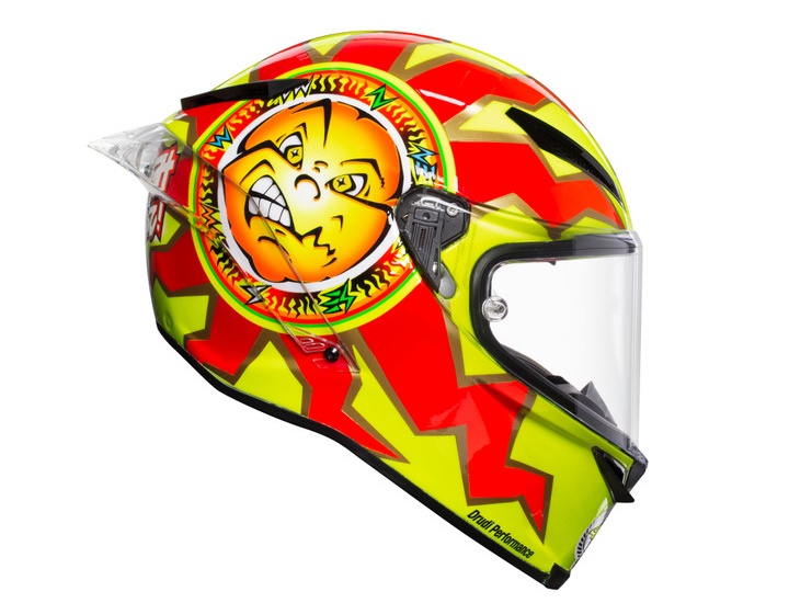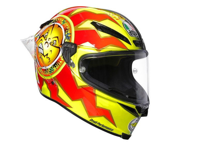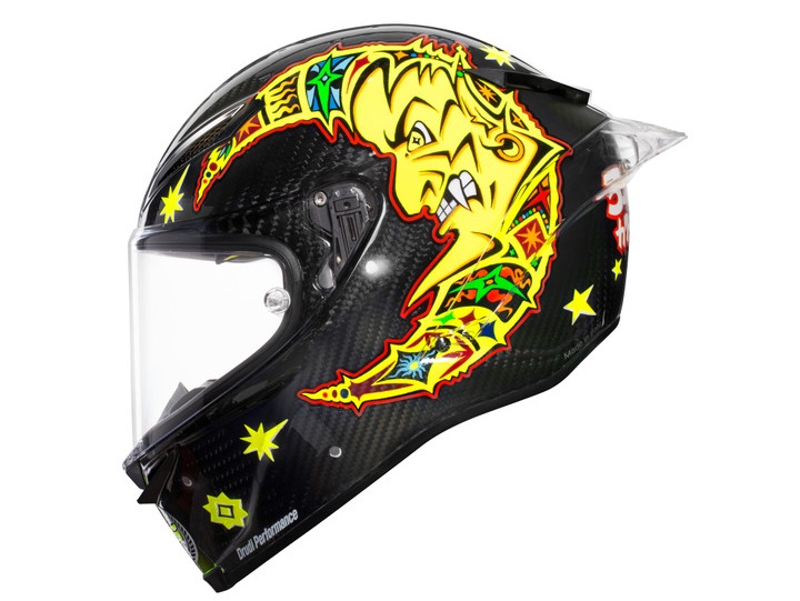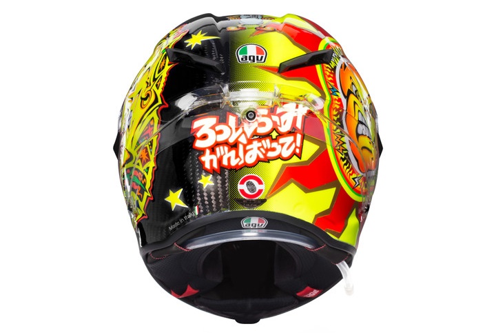 The Pista GP R carbon helmet includes the symbiotic ‘Soleluna’ motif – the sun and moon symbol that became a fundamental requirement to much of Rossi’s helmets in the future – to reflect the two different sides of his personality; also, it features an updated colour scheme of neon yellow instead of just boring ol’ yellow, the Japanese characters of ‘Go Rossifumi’’ (‘Rossifumi’ being the Italian’s early nickname inspired by his childhood hero Norigumi Abe), and an updated logo for the 20th anniversary of his historic victory.