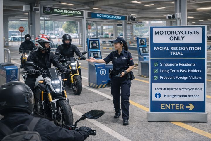 Starting 26 January 2026, the Immigration & Checkpoints Authority (ICA) will begin a facial recognition clearance trial for motorcyclists at Woodlands Checkpoint. This trial will be conducted at two designated motorcycle lanes in the Arrival Zone and aims to allow eligible motorcyclists entering Singapore to clear immigration using facial recognition instead of fingerprint scanning.