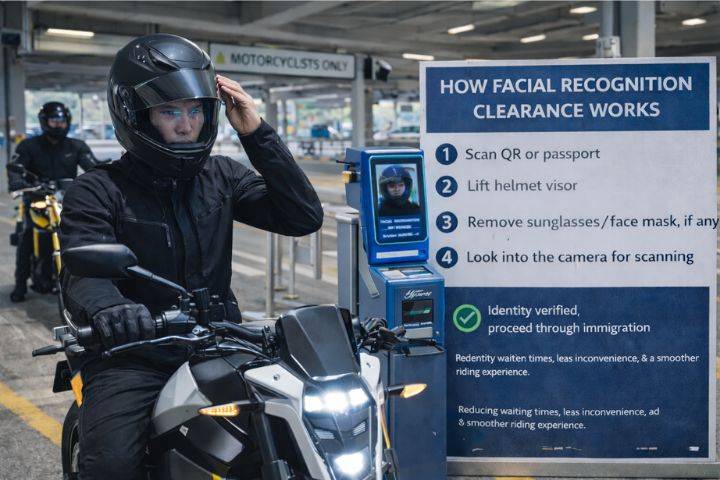 Eligible motorcyclists can clear immigration using facial recognition instead of fingerprint scanning at designated lanes.